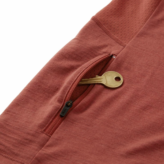 A Merino mesh back yoke and dropped rear hem will help to keep you cool and covered if you decide to push the pace, while a small side pocket with zipper from the world-leading YKK Group offers a safe place to stash your key or cards.