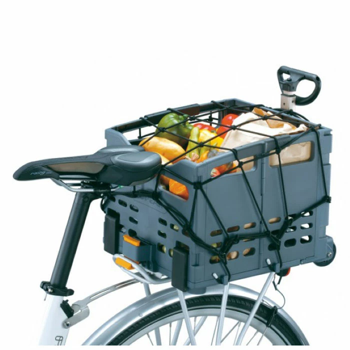 Det elastiske bagagenet sættes på Topeak TrolleyTote™ eller andre cykelkurve og holder indholdet sikkert under kørsel. Påsættes bagagebærer eller cykelkurv med holdbare, belagte kroge.